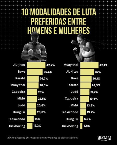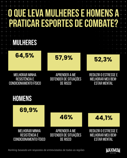 O levantamento, realizado com centenas de brasileiros de todas as regiões do país, buscou entender a relação de homens e mulheres com os esportes de luta e revelou diferenças claras nas motivações de cada gênero.
