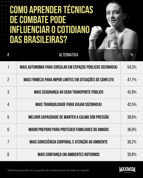 Diante do crescimento da violência contra a mulher, muitas têm buscado nos esportes de combate uma forma de aprender técnicas de autodefesa. Quando questionadas sobre os impactos que a prática poderia trazer para o dia a dia, mais da metade das mulheres acreditam que se sentiriam mais autônomas para caminhar sozinhas em espaços públicos (54,3%). Outras mudanças apontadas incluem maior firmeza para impor limites em situações de conflito (47,7%) e mais segurança ao utilizar o transporte público (42,8%).