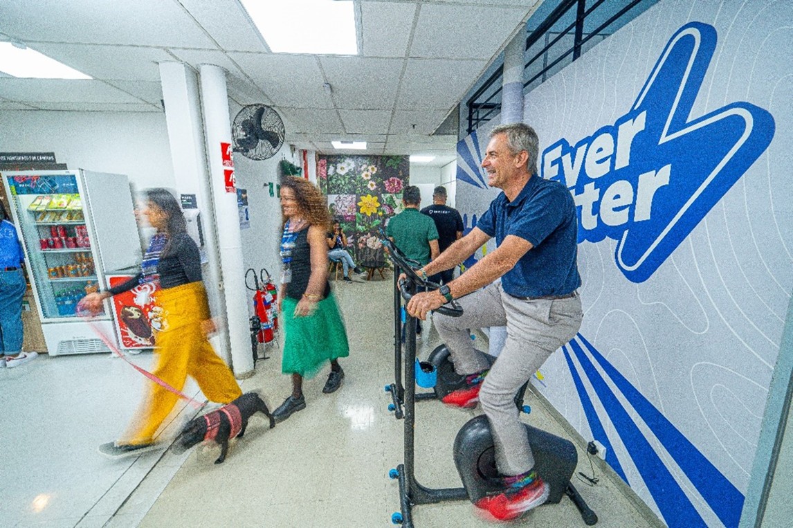 Bikes ergométricas para reuniões: a companhia oferece, em seus corredores, o aparelho esportivo para que lideranças e colaboradores possam fazer uso para qualquer necessidade – inclusive, o CEO Brasil realiza reuniões constantes com outros gestores durante o uso das bikes.